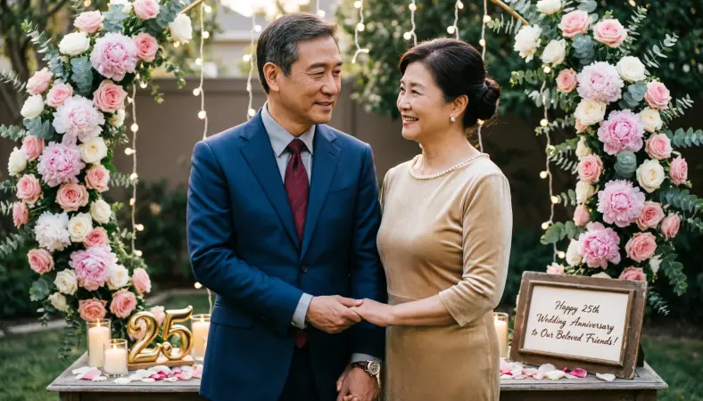 Celebrating 25th wedding anniversary wishes for friends is a heartwarming way to honor their enduring love.Romantic, cute, funny, or heartfelt, your words can make this milestone even more special and memorable for them. These wishes are perfect to express admiration, love, and joy for the beautiful journey your friends have shared together.